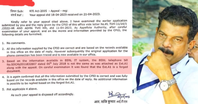 ” അപ്പീലിനൊപ്പം ഹാജരാക്കിയ എക്സിബിറ്റ് എ 1 വ്യാജമാണ്.” എന്നാണ് RTI മറുപടി. അപ്പീൽ നൽകിയത് RTI പ്രകാരം വിവരം തിരക്കിയ MLA (or MLA യുടെ ആൾ) ആണ്. അപ്പോൾ അപ്പീലിനൊപ്പം വ്യാജ Ext. A1 ഹാജരാക്കിയത് ആരാണ്?