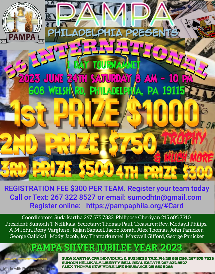 ഒന്നാം സമ്മാനമായി $1000, രണ്ടാം സമ്മാനമായി $750, മൂന്നാം സമ്മാനമായി $500, നാലാം സമ്മാനമായി $300, കൂടാതെ ട്രോഫികളും സമ്മാനിക്കും. (Venue: 608 Welsh road Philadelphia 19115).