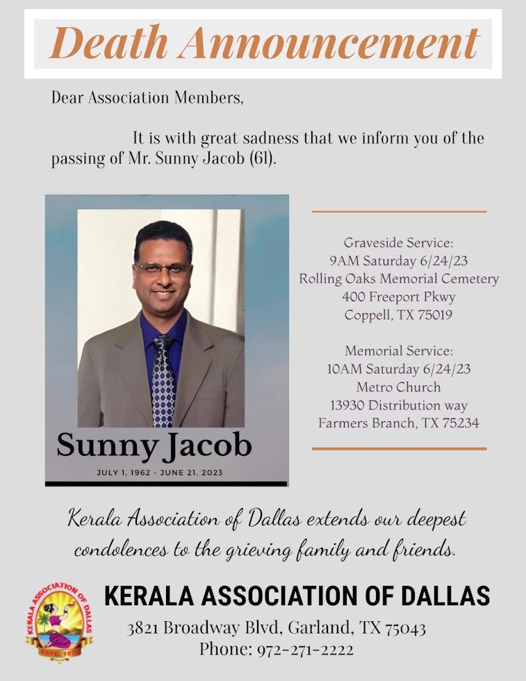 ഡാളസ്: ജൂൺ 18 ഞായറാഴ്ച വൈകിട്ട് ഡാളസ് പട്ടണത്തിലെ റോളറ്റ് സിറ്റിയിൽ അന്തരിച്ച മലയാളി സണ്ണി ജേക്കബ്ബി (60) ന്റെ നിര്യാണത്തിൽ ഡാളസ് കേരള അസോസിയേഷൻ അനുശോചിച്ചു.. കുടുംബംഗങ്ങളുടെ ദുഃഖത്തിൽ പങ്ക് ചേരുന്നതായും അനുശോചന സന്ദേശത്തിൽ പറയുന്നു .