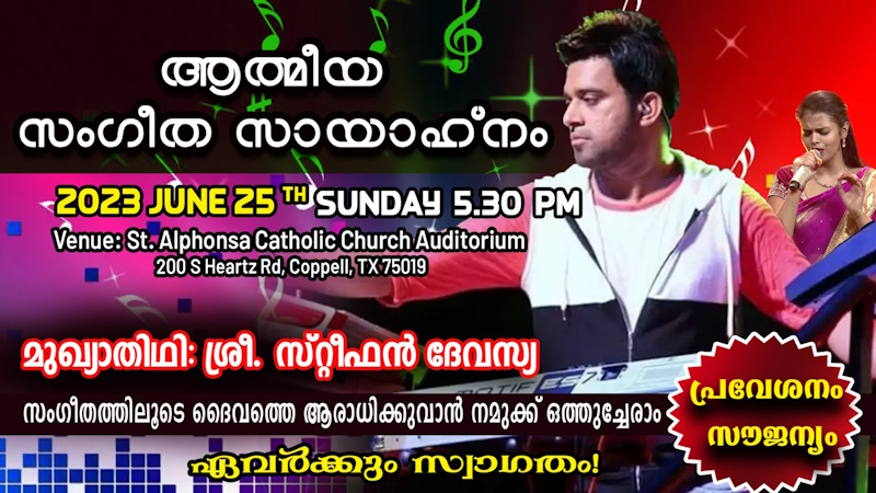 ഡാളസ് : സഭാ വ്യത്യാസം കൂടാതെ സംഗീതത്തെ സ്നേഹിക്കുന്ന ഡാളസിലെ ക്രിസ്തിയ വിശ്വാസികൾ ഒത്തുകൂടുന്ന ആത്മീയ സംഗീത സായാഹ്നം നാളെ (ഞായർ ) വൈകിട്ട് 5.30 ന് ഡാളസിലെ കോപ്പൽ സെന്റ്. അല്ഫോണ്സാ കാതോലിക് ചര്ച്ച് ഓഡിറ്റോറിയത്തില് വെച്ച് (200 S Heartz Rd, Coppell, TX 75019) നടത്തപ്പെടുന്നു.