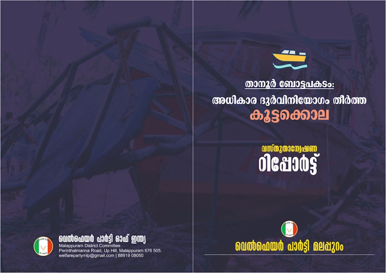 മലപ്പുറം: താനൂരിൽ നടന്ന ബോട്ടപകടത്തെക്കുറിച്ച് പഠിക്കാൻ വെൽഫെയർ പാർട്ടി നിയോഗിച്ച വസ്തുതാന്വേഷണ കമ്മീഷൻ കണ്ടെത്തിയ വിവരങ്ങൾ ഉൾപ്പെടുന്ന റിപ്പോർട്ട് ‘താനൂർ ബോട്ടപകടം: അധികാര ദുർവിനിയോഗം തീർത്ത കൂട്ടക്കൊല’ എ്ന്ന പേരിൽ പുറത്തിറക്കി. ബോട്ടിന്റെ അശാസ്ത്രീയ നിർമ്മിതിയോടൊപ്പം അധികാര-ഉദ്യോഗസ്ഥ കൂട്ടുകെട്ടിന്റെ അവിഹിത ഇടപെടലുകളും ഈ ദുരന്തത്തിന് കാരണമായിട്ടുണ്ട് എന്ന് റിപ്പോർട്ടിൽ പറയുന്നു.