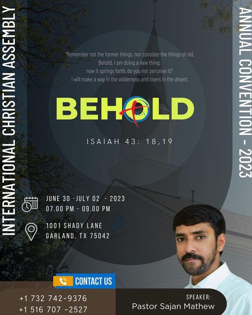 ഗാർലാൻഡ്(ഡാളസ് ):ഇന്റർനാഷണൽ ക്രിസ്ത്യൻ അസംബ്ലിയുടെ വാർഷിക കൺവെൻഷൻ ജൂൺ 30 മുതൽ ജൂലൈ 2 വരെ ഡാളസിലെ ഗാർലാൻഡിൽ (1001-ഷാഡി ലൈൻ) വെച്ച് നടത്തപ്പെടുന്നു. ആരാധനയിലും കൂട്ടായ്മയിലും ദൈവവചന പഠനത്തിലും കേന്ദ്രീകരിച്ചു പ്രവർത്തിക്കുന്ന ഇന്റർനാഷണൽ ക്രിസ്ത്യൻ അസംബ്ലി വാർഷിക കൺവെൻഷനിൽ പാസ്റ്റർ ഷാജി മാത്യു മുഖ്യ പ്രഭാഷണം നടത്തും..