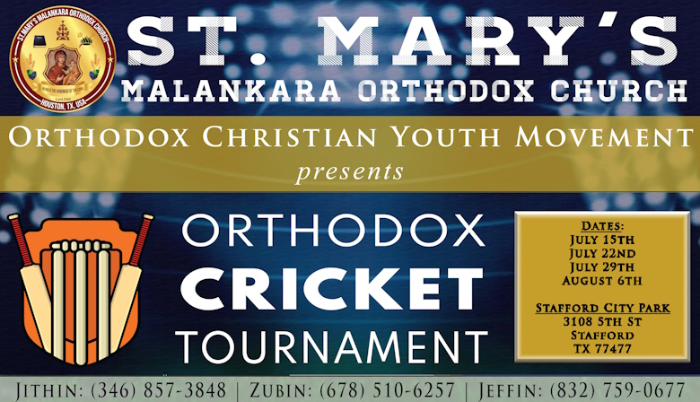 ഹൂസ്റ്റൺ: മലങ്കര ഓർത്തോഡോക്സ് സഭയുടെ സൗത്ത് വെസ്റ്റ് അമേരിക്കൻ ഭദ്രാസനത്തിലെ ഹൂസ്റ്റൺ സെന്റ് മേരീസ് ഓർത്തോഡോക്സ് ഇടവകയിലെ യൂത്ത് മൂവ്മെന്റ് (OCYM), ഹൂസ്റ്റൺ റീജിയണിലെ ഹൂസ്റ്റൺ, സാൻ അന്റോണിയോ, ഓസ്റ്റിൻ എന്നിവടങ്ങളിൽ നിന്നുമുള്ള ദേവാലയങ്ങളിലെ ക്രിക്കറ്റ് ടീമുകളെ പങ്കെടുപ്പിച്ചുകൊണ്ട് “ഹൂസ്റ്റൺ ഓർത്തോഡോക്സ് ക്രിക്കറ്റ് ടൂർണമെന്റ്” ജൂലൈ 15 മുതൽ ഓഗസ്റ്റ് 6 വരെ ഹൂസ്റ്റൺ സ്റ്റാഫോർഡ് സിറ്റി പാർക്കിൽ നടക്കും.