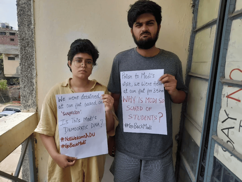 സംശയത്തിന്റെ അടിസ്ഥാനത്തിൽ ഞങ്ങളെ ഫ്ലാറ്റിൽ തടഞ്ഞുവെച്ചിരിക്കുകയാണെന്ന് പറഞ്ഞ നടപടിയിൽ പ്രതിഷേധിച്ച് അഞ്ജലിയും അഭിജ്ഞനും പ്ലക്കാർഡുകൾ ഉയർത്തിപ്പിടിച്ചു. മോദിയുടെ സന്ദർശനത്തിന് മുമ്പ് ഞങ്ങളെ 3.5 മണിക്കൂർ ഫ്ലാറ്റിൽ തടഞ്ഞുവച്ചു.