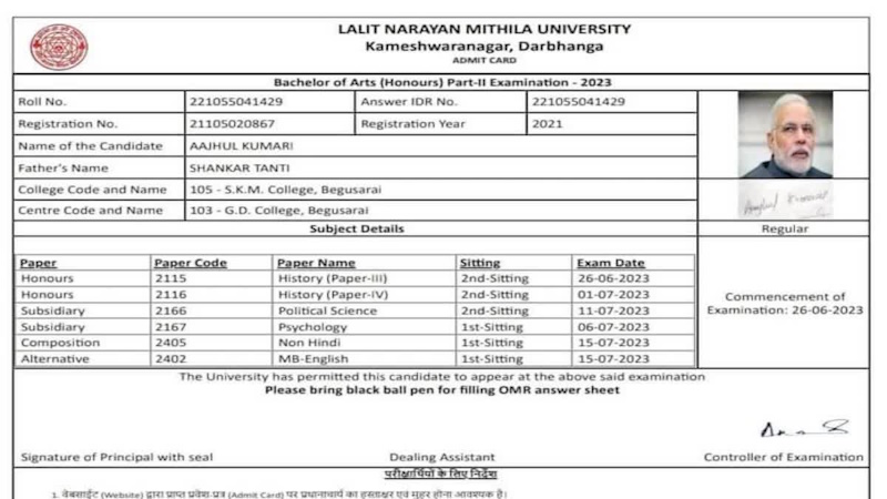 പട്ന: ബീഹാറിലെ ബെഗുസാരായി ജില്ലയിലെ ഒരു കോളേജ് നൽകിയ ഹാള് ടിക്കറ്റില് പ്രധാനമന്ത്രി നരേന്ദ്ര മോദിയുടെയും