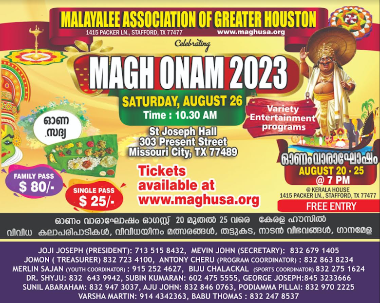 മിസൗറി സിറ്റി, ടെക്സാസ്: ഏറെ പ്രതീക്ഷയോടെ കാത്തിരിക്കുന്ന മലയാളി അസോസിയേഷൻ ഓഫ് ഗ്രേറ്റർ ഹൂസ്റ്റൺ (MAGH) മാഗ് മെഗാ ഓണാഘോഷത്തിന് ആതിഥേയത്വം വഹിക്കുന്നതിന് മിസോറി സിറ്റിയിലെ സെന്റ് ജോസഫ് ഹാൾ ഒരുങ്ങിക്കഴിഞ്ഞിരിക്കുന്നു. ഓഗസ്റ്റ് 26-ന്, കേരളത്തിന്റെ ചടുലമായ നിറങ്ങളും സമ്പന്നമായ പാരമ്പര്യങ്ങളും കൊണ്ട് സജീവമാകും. ഓണത്തിന്റെ ആ പഴയ നല്ല അനുഭവങ്ങളെ അനുസ്മരിപ്പിക്കുന്ന സാംസ്കാരിക പരിപാടികളുമായി ഈ വർഷത്തെ ഓണാഘോഷ പരിപാടി ഒരു അവിസ്മരണീയമായ അനുഭവമാകുമെന്ന് മാഗ് ബോർഡ് ഓഫ് ഡയറക്ടേഴ്സ് ഉറപ്പു നൽകി കഴിഞ്ഞിരിക്കുന്നു.