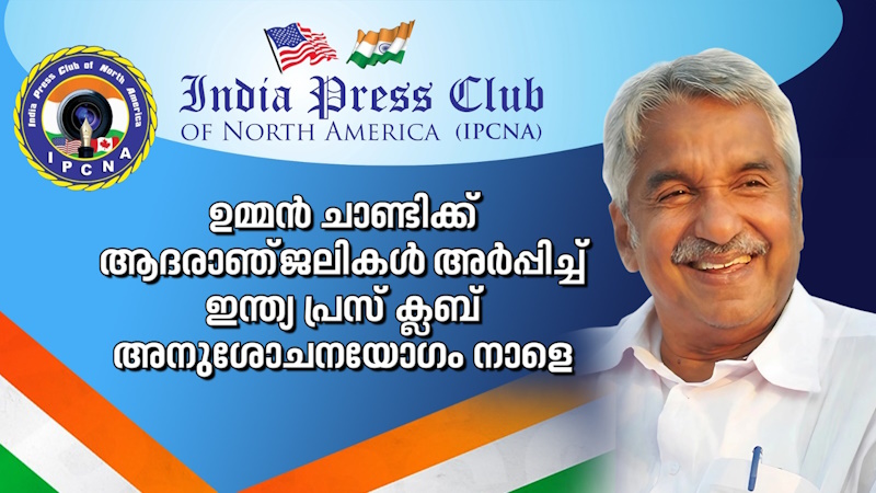മയാമി: മുൻ കേരള മുഖ്യമന്ത്രിയും , ലോക മലയാളികൾക്ക് പ്രിയങ്കരനായിരുന്ന ജനകീയ നേതാവുമായിരുന്ന ഉമ്മൻ ചാണ്ടിയോടുള്ള ആദരസൂചകമായി നാളെ ( 7/ 19 / 2023 ) ബുധനാഴ്ച വൈകീട്ട് 8 മണിക്ക് (EST ) അമേരിക്കയിലെ വിവിധ സാംസ്കാരിക -സാമൂഹിക-രാഷ്ട്രീയ സംഘടനകളെ ഉൾപ്പെടുത്തി ഇന്ത്യ പ്രസ് ക്ലബ് zoom ൽ അനുശോചന യോഗം സംഘടിപ്പിക്കും. കക്ഷിരാഷ്ടീയ ഭേദമന്യേ എല്ലാവരും ഈ zoom മീറ്റിങ്ങിൽ പങ്കെടുക്കണമെന്ന് സംഘാടകർ അഭ്യർത്ഥിച്ചു.