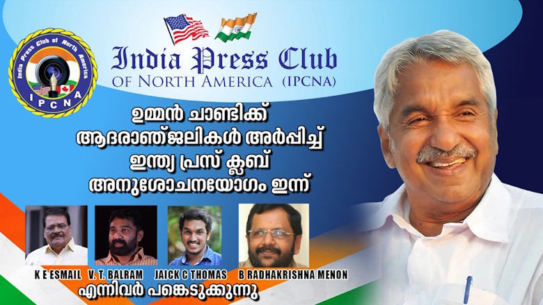 മയാമി: മുൻ കേരള മുഖ്യമന്ത്രി ഉമ്മൻ ചാണ്ടിയോടുള്ള ആദരസൂചകമായി ഇന്ത്യാ പ്രസ് ക്ലബ് ഓഫ് നോർത്ത് അമേരിക്ക ഇന്ന് (ബുധൻ) വൈകിട്ട് 8 മണിക്ക് (EST ) സംഘടിപ്പിക്കുന്ന അനുശോചന യോഗത്തിൽ ഇന്ത്യയിൽ നിന്ന് വിവിധ പാർട്ടി നേതാക്കളും പങ്കെടുക്കുന്നു. മുൻ റവന്യു മന്ത്രി കെ.ഇ. ഇസ്മായിൽ (സി.പി.ഐ), കെ.പി.സി.സി. വൈസ് പ്രസിഡന്റും മുൻ എം.എൽ.എയുമായ വി.ടി ബാലറാം, ഡി.വൈ.എഫ്.ഐ കേന്ദ്ര കമ്മിറ്റി അംഗം ജെയ്ക്ക് സി. തോമസ്, ബി.ജെ.പി. സംസ്ഥാന സമിതി അംഗം അഡ്വ. ബി. രാധാകൃഷ്ണ മേനോൻ എന്നിവരാണ് പങ്കെടുക്കുന്നത്.
