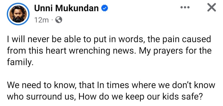 അദ്ദേഹം എഴുതി: “എനിക്ക് പറയാന് വാക്കുകളില്ല…. ഈ ഹൃദയസ്പർശിയായ വാർത്തയിൽ നിന്നുള്ള വേദന. കുടുംബത്തിന് വേണ്ടി എന്റെ പ്രാർത്ഥനകൾ. നമ്മളെ വലയം ചെയ്യുന്നവർ ആരാണെന്ന് അറിയാത്ത കാലത്ത് നമ്മുടെ കുട്ടികളെ എങ്ങനെ സുരക്ഷിതരാക്കും എന്ന് നമ്മൾ അറിയണം….”
