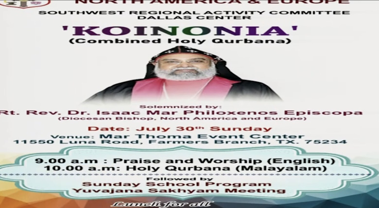 ഡാളസ്: നോർത്ത് അമേരിക്ക യൂറോപ്പ് മാർത്തോമാ ഭദ്രാസന ആർ എ സി സൗത്ത് വെസ്റ്റ് സെന്റർ എ യിലെ എല്ലാ മാർത്തോമ്മാ പള്ളികകളും സംയോജിച്ചുള്ള വിശുദ്ധ കുർബാന ശുശ്രുഷ ഫാർമേഴ്സ് ബ്രാഞ്ച് മാർത്തോമ്മാ ഇവന്റ് സെന്ററിൽ (1550 ലൂണ റോഡ്, ഫാർമേഴ്സ് ബ്രാഞ്ച് ടെക്സാസ് 75234,) 2023 ജൂലൈ 30 ഞായറാഴ്ച ക്രമീകരിച്ചിരിക്കുന്നു . വിശുദ്ധ കുർബാന ശുശ്രൂഷകു ഭദ്രാസനാധിപൻ ബിഷപ്പ് റൈറ്റ് ഐസക് മാർ ഫിലക്സിനോസ് എപ്പിസ്കോപ്പ മുഖ്യ കാർമീകത്വം വഹിക്കും . ഡാളസിലെ മാർത്തോമാ ഇടവകകളിലെ പട്ടക്കാർ സഹ കാർമീകരായിരിക്കും