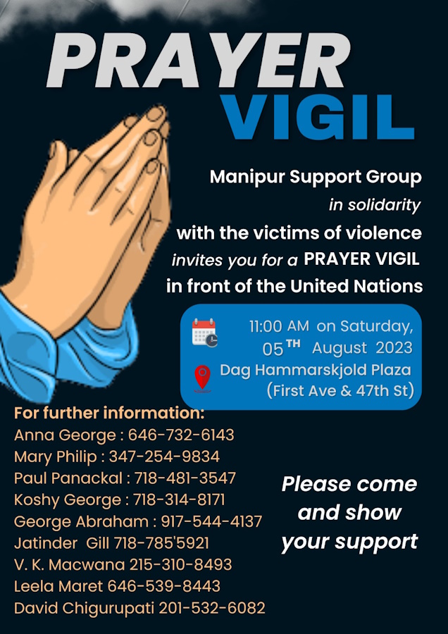 ‘Concerned Citizens on Manipur,’ an activist group, is organizing a prayer vigil in front of the United Nations building in Manhattan on Saturday, August 5th, at 11 am in solidarity with the victims of violence in the northeastern State of Manipur in India and to pray for restoration of peace.