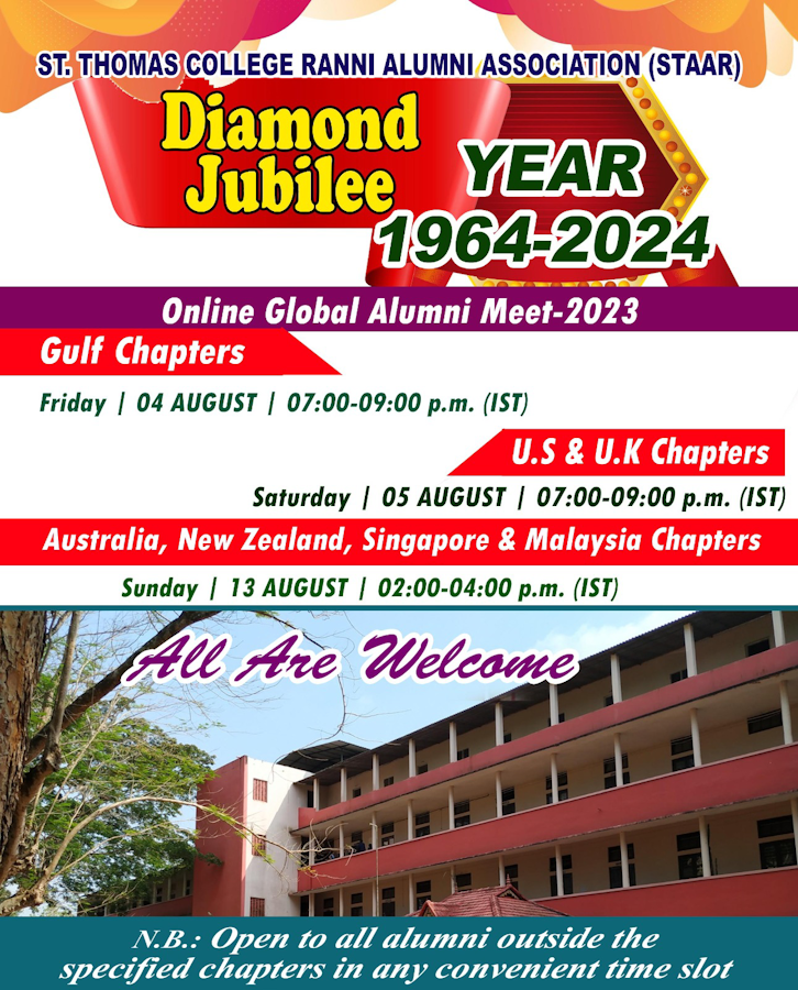 ഹൂസ്റ്റൺ: 2024 ജൂലൈയിൽ നടത്തപ്പെടുന്ന റാന്നി സെന്റ് തോമസ് കോളേജിന്റെ വജ്ര ജൂബിലി ആഘോഷത്തിന് മുന്നോടിയായി കോളേജിലെ പൂർവ്വ വിദ്യാർത്ഥികളുടെ ഗ്ലോബൽ അലുമിനി സൂം മീറ്റിംഗുകൾ സംഘടിപ്പിക്കുന്നു. St. Thomas College Ranni Alumni Association (STAAR) ന്റെ ആഭിമുഖ്യത്തിലാണ് മീറ്റിംഗുകൾ നടത്തുന്നത്