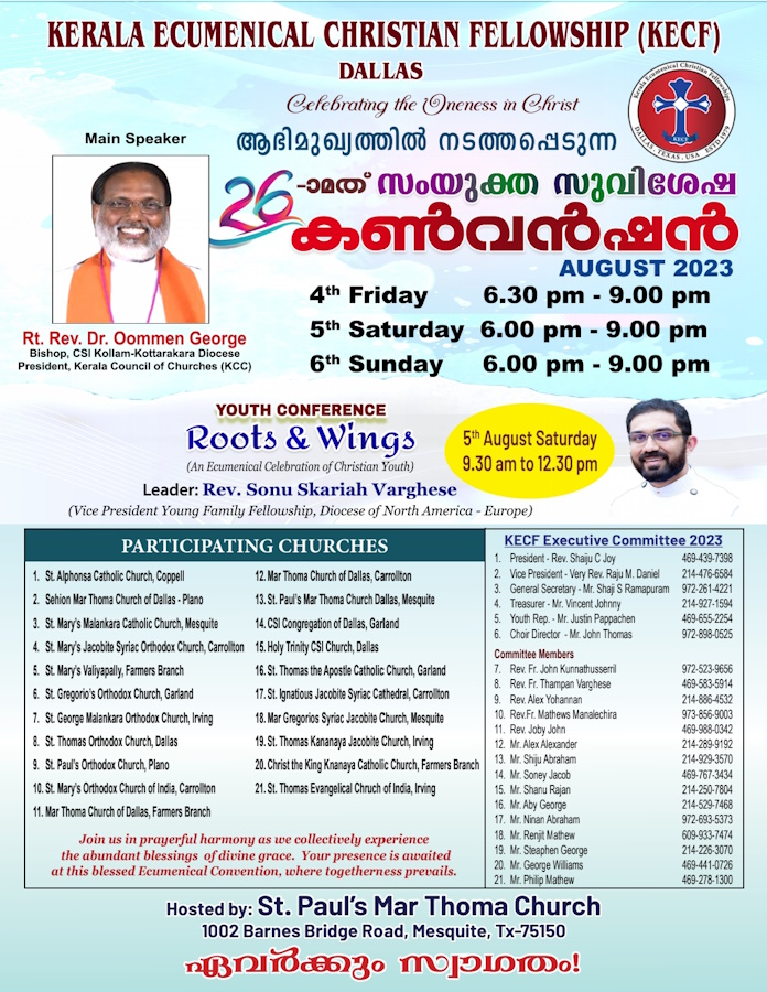 ഇന്നും ,ശനി, ഞായർ ( Aug 4,5,6) തുടങ്ങിയ ദിവസങ്ങളിൽ നടത്തപ്പെടുന്ന സംയുക്ത കൺവെൻഷനിലേക്ക് ഡാളസിലെ എല്ലാവിശ്വാസികളെയും സ്നേഹത്തോടെ ക്ഷണിക്കുന്നതായി സംഘാടകർ അറിയിച്ചു.