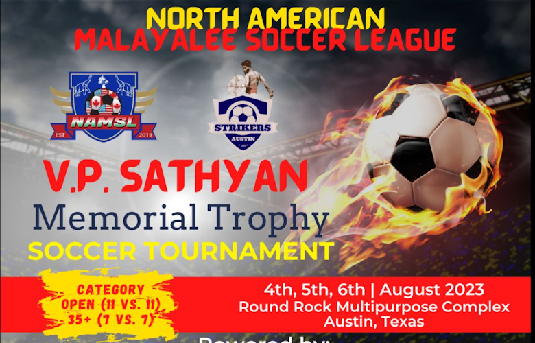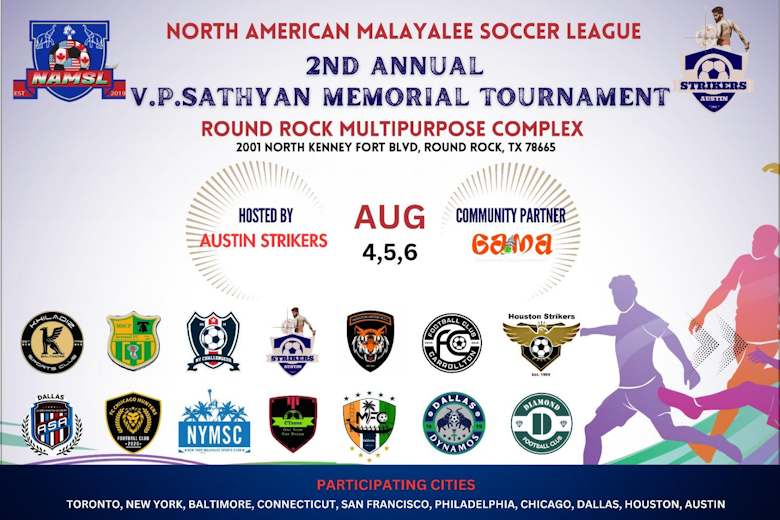 റൌണ്ട് റോക്ക് (ഓസ്റ്റിൻ): കാൽപ്പന്തിന്റെ ആവേശം നെഞ്ചേറ്റി നോർത്ത് അമേരിക്കയിലെ മലയാളി ഫുട്ബോൾ ക്ലബ്ബുകൾ പങ്കെടുക്കുന്ന രണ്ടാമത് വി.പി.സത്യൻ മെമ്മോറിയൽ ടൂർണമെന്റിന് ടെക്സാസിലെ ഓസ്റ്റിനിൽ ഇന്ന് തുടക്കം. നോർത്ത് അമേരിക്കൻ സോക്കർ ലീഗ് എന്നറിയപ്പെടുന്ന (NAMSL) ഈ ടൂർണമെന്റിന് ആതിഥ്യം വഹിക്കുന്നത് ഓസ്റ്റിനിലെ മലയാളി ക്ലബായ ഓസ്റ്റിൻ സ്ട്രൈക്കേഴ്സാണ്.