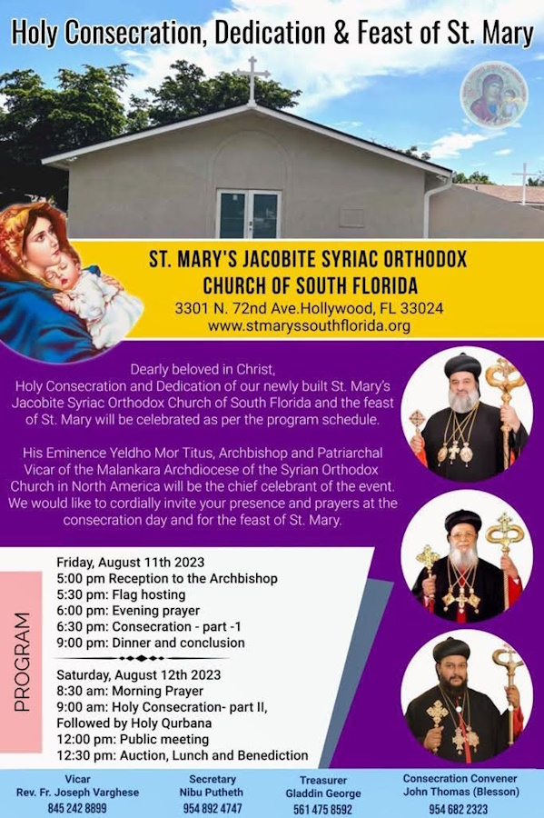 സൗത്ത് ഫ്ലോറിഡ : ഒന്നര പതിറ്റാണ്ടിലേറെ പ്രാർത്ഥനാപൂർവ്വം കാത്തിരുന്ന സൗത്ത് ഫ്ലോറിഡയിലെ സെൻറ് മേരീസ് യാക്കോബായ ഇടവക അംഗങ്ങൾക്ക് സ്വപ്നസാഫല്യമായി ഒരു ദേവാലയം .. സെന്റ് മേരീസ് യാക്കോബായ സുറിയാനി ഓർത്തഡോക്സ് ദേവാലയം ആഗസ്റ്റ് 11 വെള്ളി, ഓഗസ്റ്റ് 12 ശനി തീയതികളിൽ നടക്കുന്ന ഭക്തിനിർഭരമായ വിശുദ്ധകർമങ്ങളോടെ ആർച്ച് ബിഷപ്പ് മോർ തീത്തോസ് യെൽദോ മെത്രാപ്പോലീത്തയുടെ മുഖ്യ കാർമികത്വത്തിൽ കൂദാശ ചെയ്യപ്പെടുന്നു. 2006 ൽ ആണ് സെന്റ് മേരീസ് യാക്കോബായ സുറിയാനി ഓർത്തഡോക്സ് ഇടവക സൗത്ത് ഫ്ലോറിഡയിൽ ആരംഭിക്കുന്നത്,