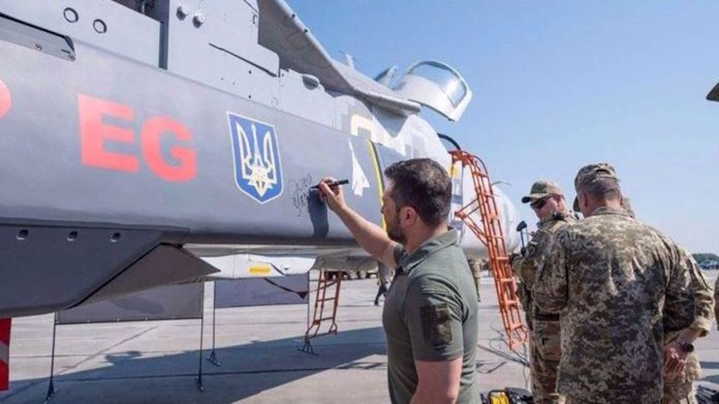 ഫ്രഞ്ച് പതാകയുടെ നിറങ്ങളിൽ തിളങ്ങുന്ന ഫ്രഞ്ച് നിർമ്മിത മിസൈൽ, ബോംബർ വിമാനത്തിനടിയിൽ ഘടിപ്പിച്ചിരിക്കുന്ന ഉക്രേനിയൻ കോട്ട് ഓഫ് ആംസ് എന്നിവയിൽ സെലെൻസ്കി ഒപ്പിടുന്നത് കാണിച്ചു.