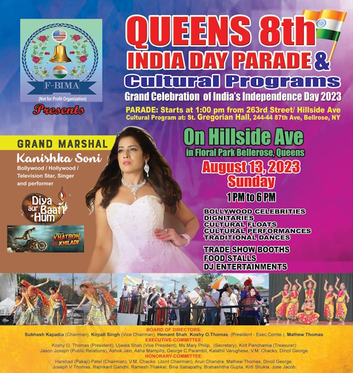ഹിൽസൈഡ് അവന്യൂവിലെ 263-മത് സ്ട്രീറ്റിൽ നിന്നും ഞായറാഴ്ച്ച ഉച്ചക്ക് ഒരു മണിക്ക് ആരംഭിക്കുന്ന പരേഡിന്റെ ഫ്ളാഗ് ഓഫ് ന്യൂയോർക്ക് സിറ്റി മേയർ എറിക് ആദംസ് നിർവ്വഹിക്കുന്നതാണെന്ന് അസ്സോസ്സിയേഷൻ പ്രസിഡന്റ് കോശി ഓ തോമസ് പ്രസ്താവിച്ചു. വിവിധ രാഷ്ട്രീയ-സാമൂഹിക-സാമുദായിക നേതാക്കളും പരേഡിൽ പങ്കെടുക്കും. ബോളീവുഡ് സിനിമാ-ടെലിവിഷൻ താരവും ഗായികയുമായ കനിഷ്കാ സോണി പരേഡിൻറെ ഗ്രാൻഡ് മാർഷൽ ആയിരിക്കും.