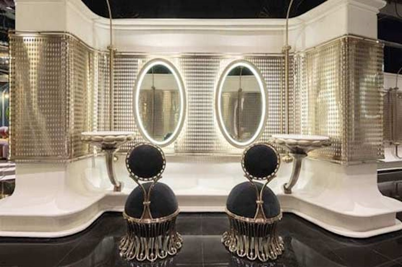 ഈ ബാത്ത്റൂമിൽ അമൂർത്തമായ ജ്യാമിതിയും പൂക്കളിൽ നിന്നും പ്രാണികളിൽ നിന്നും പ്രചോദനം ഉൾക്കൊണ്ട ആകൃതികളും മുതൽ പ്ലഷ് വാനിറ്റി കസേരകളും ധാരാളം എൽഇഡി സ്ട്രിപ്പുകളും വരെ നിരവധി കാര്യങ്ങളുണ്ട്. ഡിസൈൻ ശൈലി ശരിക്കും ആകര്ഷണീയവും അതിമനോഹരവുമാണ്. ഒരു സാധാരണ ഷോപ്പിംഗ് മാളിലെ പൊതുകുളി മുറിയില് നിന്ന് ഈ കുളിമുറി വേറിട്ടു നില്ക്കുന്നതും അക്കാരണം കൊണ്ടാണ്.