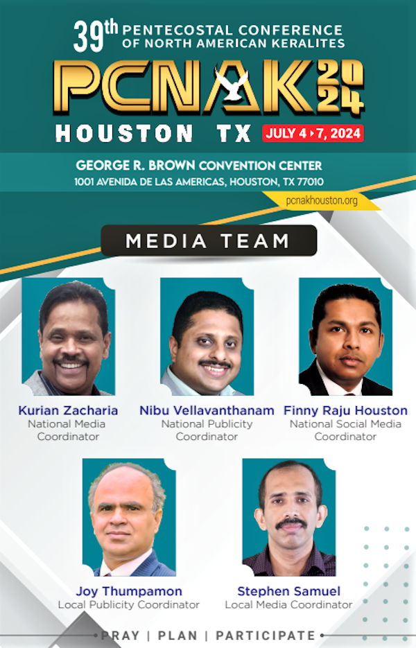 നോർത്ത് അമേരിക്കൻ മലയാളി പെന്തക്കോസ്ത് കോൺഫറൻസ് വിജയകരമാക്കുന്നതിന് മീഡിയയുടെ സാധ്യതകൾ പരമാവധി പ്രയോജനപ്പെടുത്തുക എന്ന ലക്ഷ്യത്തോടെയാണ് വിപുലമായ മീഡിയ ടീമിനെ തെരഞ്ഞെടുത്തിരിക്കുന്നതെന്ന് ഹൂസ്റ്റൺ കോൺഫ്രൻസ് നാഷണൽ ഭാരവാഹികളായ പാസ്റ്റർ ഫിന്നി ആലുംമൂട്ടിൽ, രാജു പൊന്നോലിൽ, ബിജു തോമസ്, റോബിൻ രാജു, ആൻസി സന്തോഷ് എന്നിവർ അറിയിച്ചു.