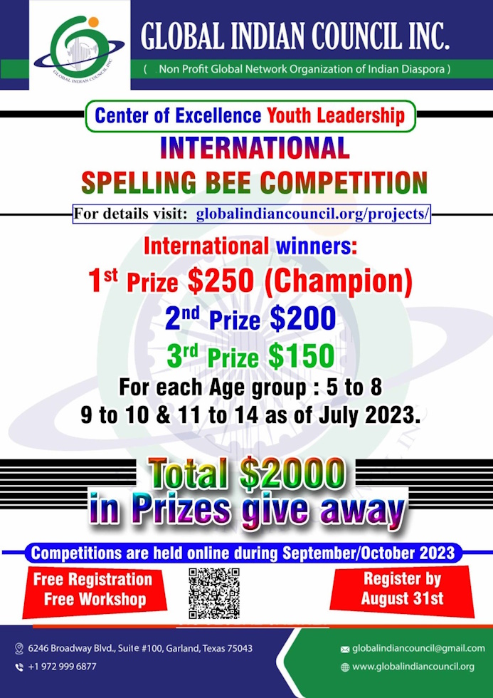 ലോകമെമ്പാടുമുള്ള ഇന്ത്യൻ പ്രവാസികളുടെ ഏറ്റവും വലിയ ശൃംഖലയും അതിവേഗം വളരുന്നതുമായ NGO കൂട്ടായ്മയാണ് ഗ്ലോബൽ ഇന്ത്യൻ കൗൺസിൽ (ജിഐസി). ജിഐസി ഉടൻ തന്നെ കുട്ടികൾക്കായി ഒരു അന്താരാഷ്ട്ര സ്പെല്ലിംഗ് ബീ മത്സരം നടത്തുന്നുണ്ട്. കൂടുതൽ വിവരങ്ങൾ ഫ്ലയറിൽ സംഗ്രഹിച്ചിരിക്കുന്നു.