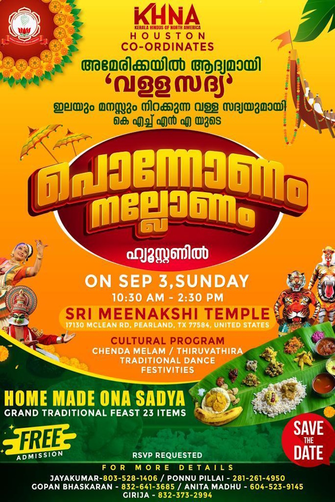 മാവേലി എഴുന്നെള്ളത്തും തിരുവാതിരയും നൃത്ത നിർത്യങ്ങളും ഒക്കെ പരമ്പരാഗത ഓണാഘോഷത്തിൽ പെടുമ്പോൾ ഒരുപടികൂടി കടന്നു ഇലയും മനസ്സും നിറക്കുന്ന ആറന്മുള വള്ളസദ്യ ഒരുക്കിയാണ് കെ എച് എൻ എ ഹ്യൂസ്റ്റൺ വ്യത്യസ്തമാകുന്നത്. കെ എച് എൻ എ അംഗങ്ങൾക്കായി ഒരുക്കുന്ന ഓണത്തിൽ കെ എച് എൻ എ കൺവൻഷന് രജിസ്റ്റർ ചെയ്തവർക്കും രജിസ്റ്റർ ചെയ്യാനുദ്ദേശിക്കുന്നവർക്കും പങ്കെടുക്കാം. പ്രവേശനം സൗജന്യമായിരിക്കും. സെപ്തംബർ മൂന്നാംതീയതി ഞായറാഴ്ച 10:30 മുതൽ ഉച്ചക്ക് 2 മണിവരെ പിയർലാന്റിലെ ശ്രി മീനാക്ഷി ക്ഷേത്ര ഓഡിറ്റോറിയത്തിലായിരിക്കും ഓണപരിപാടികൾ നടക്കുക. ജയകുമാർ നടയ്ക്കനാൽ ആണ് ഓണപരിപാടികളുടെ കോർഡിനേറ്റർ. ഉഷ അനിൽകുമാർ സദ്യയുടെ കോർഡിനേറ്ററും ആയിരിക്കും.