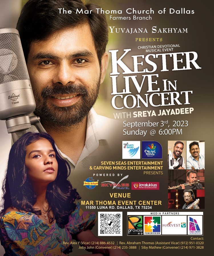 ഡാളസ്.  ക്രിസ്തീയ സംഗീത ലോകത്തെ സ്വർഗീയ ഗായകൻ കെസ്റ്ററും, മലയാള ചലച്ചിത്ര, ഭക്തി ഗാന രംഗത്ത് സംഗീതത്തെ സ്നേഹിക്കുന്ന ഏവരുടെയും ഹൃദയ താളങ്ങളായി മാറി കഴിഞ്ഞ മലയാളത്തിന്റെ കൊച്ചു വാനമ്പാടി ശ്രേയ ജയ്ദീപും ഒരുമിക്കുന്ന ക്രിസ്തീയ സംഗീത വിരുന്ന് കെസ്റ്റർ ലൈവ് ഇൻ കൺസേർട്ട് നാളെ (ഞായറാഴ്ച) വൈകിട്ട്  6 മണിക്ക് മാർത്തോമ്മാ ഇവന്റ് സെന്ററിൽ (11550 Luna Road, Farmers Branch, Tx, 75234) വെച്ച് നടത്തപ്പെടുന്നു.