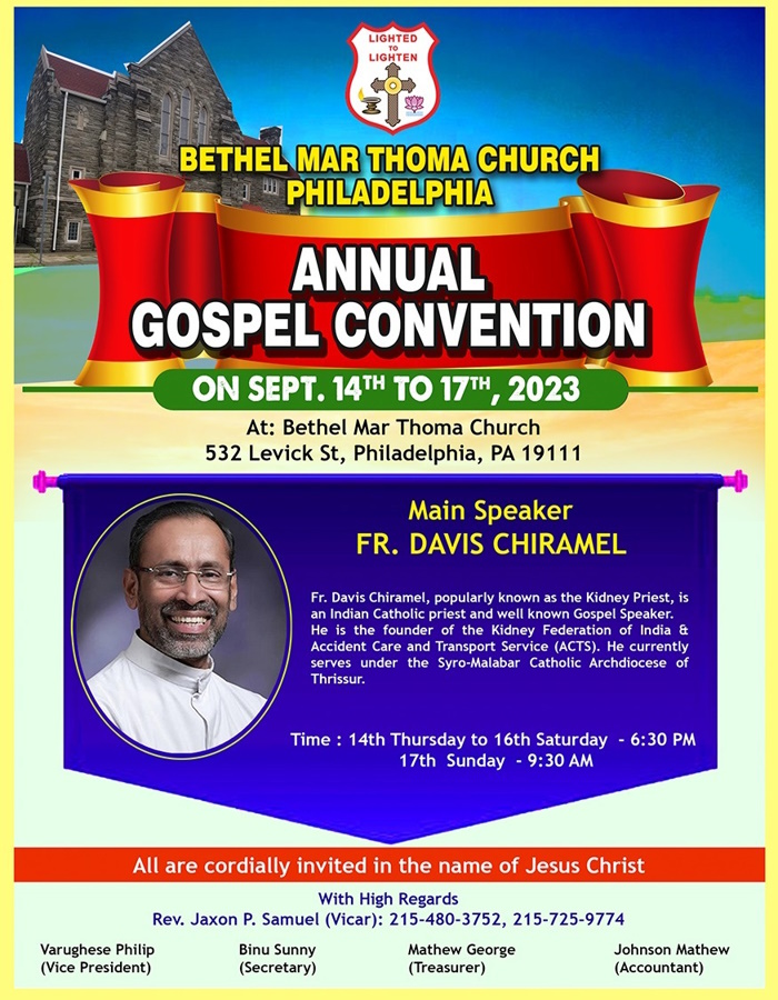 ഫിലാഡൽഫിയായിലെ എല്ലാ വിശ്വാസ സമൂഹത്തെയും അടുത്ത വ്യാഴാഴ്ച മുതൽ നടത്തപ്പെടുന്ന കൺവെൻഷനിലേക്ക് ബഥേൽ മാർത്തോമ്മാ ഇടവകയുടെ പേരിൽ സ്നേഹത്തോടെ ക്ഷണിക്കുന്നതായി റവ. ജാക്സൺ പി. സാമൂവേൽ ( ഇടവക വികാരി), വർഗീസ് ഫിലിപ്പ് (വൈസ്. പ്രസിഡന്റ്), ബിനു സണ്ണി (സെക്രട്ടറി), മാത്യു ജോർജ് (ട്രസ്റ്റി), ജോൺസൻ മാത്യു (അക്കൗണ്ടന്റ്) എന്നിവർ അറിയിച്ചു.