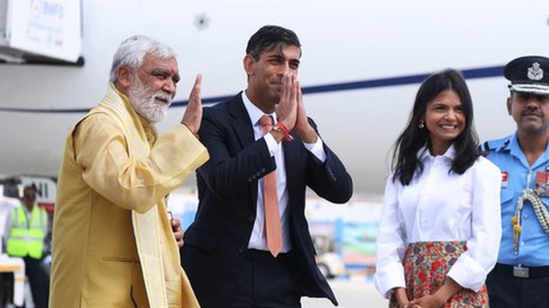 ഇന്ന് (സെപ്തംബർ 9 ന്) ആരംഭിച്ച രണ്ട് ദിവസത്തെ ജി 20 ഉച്ചകോടിക്കായി ഋഷി സുനക്കും ഭാര്യ അക്ഷത മൂർത്തിയും വെള്ളിയാഴ്ച തലസ്ഥാന നഗരിയിൽ എത്തി. കേന്ദ്രമന്ത്രി അശ്വിനി കുമാർ ചൗബെ വിമാനത്താവളത്തിൽ അദ്ദേഹത്തെ സ്വീകരിച്ചു. ഒരു രുദ്രാക്ഷം, ഭഗവദ്ഗീതയുടെ ഒരു പകർപ്പ്, ഹനുമാൻ ചാലിസ എന്നിവ ചൗബെ സുനക്ക് സമ്മാനമായി നൽകിയിരുന്നു.