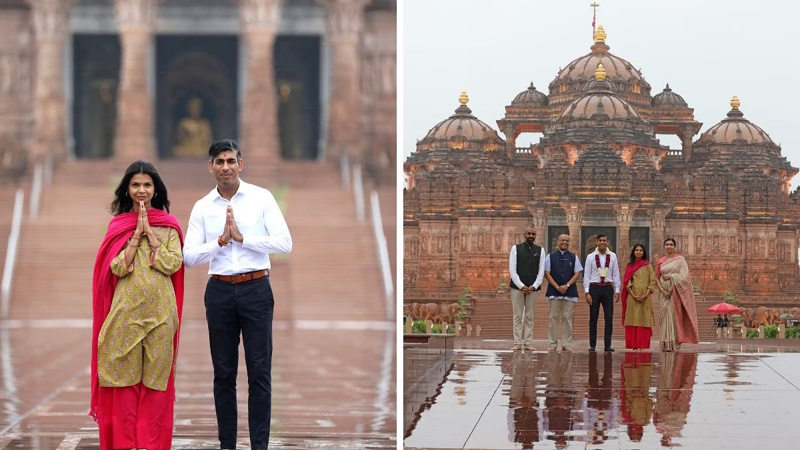 ന്യൂഡൽഹി: ബ്രിട്ടീഷ് പ്രധാനമന്ത്രി ഋഷി സുനക്കും (Rishi Sunak) ഭാര്യ അക്ഷതാ മൂർത്തിയും (Akshatha Murthy) ന്യൂഡൽഹിയിൽ നടക്കുന്ന ജി 20 ഉച്ചകോടിയുടെ രണ്ടാം ദിവസമായ ഇന്ന് (സെപ്റ്റംബർ 10 ഞായര് ) ഡൽഹിയിലെ അക്ഷര്ധാം ക്ഷേത്രം (Akshardham Temple) സന്ദർശിച്ചു. ഡൽഹിയിലെ അക്ഷർധാം ക്ഷേത്രത്തിൽ ഭാര്യ അക്ഷതാ മൂർത്തിക്കൊപ്പം യുകെ പ്രധാനമന്ത്രി നിൽക്കുന്ന ചിത്രങ്ങളാണ് ക്ഷേത്ര ഭരണസമിതി പുറത്തുവിട്ടത്. ഇന്ന് രാവിലെയാണ് അദ്ദേഹവും ഭാര്യയും ക്ഷേത്രം സന്ദർശിച്ചത്.