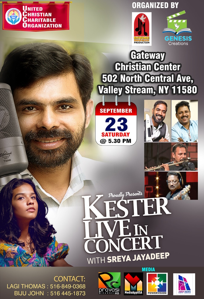 ന്യൂയോർക്ക് : യുണൈറ്റഡ് ക്രിസ്ത്യൻ ചാരിറ്റബിൾ ഓർഗനൈസേഷന്റെയും ഗ്ലോബൽ കൊളിഷൻ ആൻഡ് ബോഡി വർക്സിന്റെയും നേതൃത്വത്തിൽ ഒരുക്കുന്ന കെസ്റ്റർ ലൈവ് ഇൻ കൺസേർട്ട് ഡിവോഷണൽ മ്യൂസിക് ഇവെന്റ് സെപ്റ്റംബർ 23 ശനിയാഴ്ച വൈകിട്ട് 5.30 ന് ന്യൂയോർക്ക് വാലി സ്ട്രിമിലുള്ള ഗേറ്റ് വേ ക്രിസ്ത്യൻ സെന്ററിൽ വെച്ച് (502 N Central Ave, Valleystream, NY 11580) നടത്തപ്പെടുന്നു.