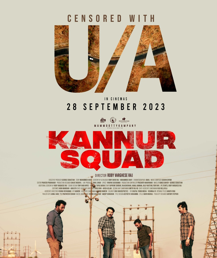 മമ്മൂട്ടി കമ്പനിയുടെ നാലാമത് ചിത്രം കണ്ണൂർ സ്ക്വാഡിന്റെ റിലീസ് തീയതി പ്രഖ്യാപിച്ചു. സെപ്റ്റംബർ 28ന് ചിത്രം തിയേറ്ററുകളിലേക്കെത്തും. മെഗാ സ്റ്റാർ മമ്മൂട്ടി ASI ജോർജ് മാർട്ടിനായി കണ്ണൂർ സ്ക്വാഡിൽ എത്തുമ്പോൾ തന്റെ കരിയറിലെ സാമ്യതകളില്ലാത്ത പോലീസ് വേഷത്തിലെ അഭിനയത്തിലൂടെ പ്രേക്ഷകരെ വിസ്മയിപ്പിക്കുമെന്നുറപ്പാണ്. ചിത്രത്തിന്റെ സെൻസറിങ് പൂർത്തിയായി യു എ സർട്ടിഫിക്കറ്റ് ആണ് ചിത്രത്തിന് ലഭിച്ചിരിക്കുന്നത്.