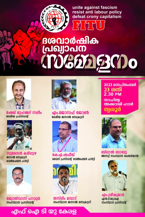 കേന്ദ്ര – കേരള സർക്കാരുകൾ തൊഴിലാളി വിരുദ്ധ നിലപാടുകളുമായാണ് മുന്നോട്ട് പോകുന്നത്. തൊഴിലവകാശങ്ങളെ ഹനിക്കുന്ന ലേബർ കോഡുകൾ നൂറ്റാണ്ടുകൾ നീണ്ട പോരാട്ടങ്ങളിലൂടെ തൊഴിലാളികൾ നേടിയ അവകാശങ്ങളെ ഹനിക്കുന്നതാണ്. സംസ്ഥാന സർക്കാരുകൾ സമീപകാലത്ത് വരുത്തിയ ചുമട്ടു തൊഴിലാളി നിയമം അടക്കമുള്ള നിയമ ഭേദഗതികളും തൊഴിലാളി വിരുദ്ധങ്ങളാണ്. ഇത്തരം നടപടികൾക്കെതിരെ പല തൊഴിലാളി സംഘടനകളും പ്രക്ഷോഭത്തിന് തയ്യാറാകുന്നില്ല എന്നതും ഖേദകരമാണ്. തൊഴിലാളികളുടെ അവകാശങ്ങളെ നിലനിർത്താൻ ബദൽ തൊഴിലാളി സംഘടന എന്ന നിലയിലാണ് എഫ്.ഐ.ടി.യു രംഗത്ത് വരുന്നത്. സമാന ചിന്താഗതിയുള്ള തൊഴിലാളി സംഘടനകളുായി ഐക്യപ്പെട്ട് ശക്തമായ തൊഴിലാളി മുന്നേറ്റങ്ങൾ രൂപപ്പെടുത്തുക എന്ന ആശയം എഫ്.ഐ.ടി.യു മുന്നോട്ട് വെയ്ക്കുന്നു. കഴിഞ്ഞ 10 വർഷത്തെ തൊഴിലവകാശ മുന്നേറ്റങ്ങൾ മുന്നിൽ വെച്ച് എഫ്.ഐ.ടി.യു അതിന്റെ ദശ വാർഷിക പരിപാടികൾ രാജ്യമെങ്ങും കാമ്പയിനുകളായും സമരപരിപാടികളായും സംഘടിപ്പിക്കുന്നു. ദശവാർഷിക പ്രഖ്യാപന സമ്മേളനം നടക്കുകയാണ് 23 / 09 / 2023 നു ഉച്ചയ്ക്ക് 2.30 നു തൃശൂർ സാഹിത്യ അക്കാദമി ഹാളിൽ വെച്ച്. ദേശീയ പ്രസിഡണ്ട് ഷൈഖ് മുഹമ്മദ് സലീം ഉദ്ഘാടനം ചെയ്യും. സമ്മേളനത്തിൽ പ്രമുഖ ട്രേഡ് യൂണിയൻ , രാഷ്ടീയ നേതാക്കൾ പങ്കെടുക്കും
