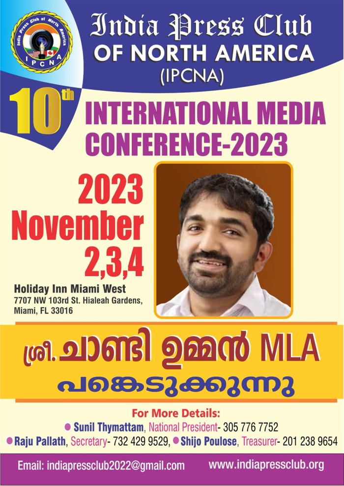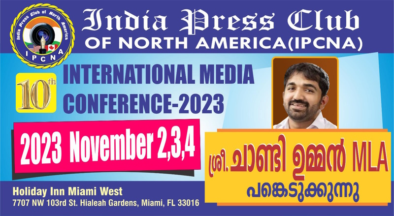 ഇന്ത്യ പ്രസ് ക്ളബ് ഓഫ് നോര്ത്ത് അമേരിക്കയുടെ പത്താമത് അന്താരാഷ്ട്ര മാധ്യമ സമ്മേളനത്തിനായി മയാമി ഒരുങ്ങിക്കഴിഞ്ഞു. കേരളത്തില് നിന്നുള്ള പ്രമുഖ മാധ്യമ പ്രവര്ത്തകര്ക്കൊപ്പം പുതുപ്പള്ളിയിലെ പുതിയ നായകൻ ചാണ്ടി ഉമ്മൻ എം.എൽ.എയും സമ്മേളനത്തിൽ പങ്കെടുക്കും. മുന് മുഖ്യമന്ത്രി ഉമ്മന്ചാണ്ടിയുടെ വിയോഗത്തെ തുടര്ന്ന് പുതുപ്പള്ളിയില് നടന്ന ഉപതെരഞ്ഞെടുപ്പില് ചരിത്ര വിജയം നേടിയ ശേഷം ചാണ്ടി ഉമ്മന് പങ്കെടുക്കുന്ന ആദ്യത്തെ അന്താരാഷ്ട്ര പരിപാടി കൂടിയാണ് മയാമിയിലെ മാധ്യമ സമ്മേളനം. നവംബര് 2,3,4 തിയതികളില് നടക്കുന്ന ഇന്ത്യ പ്രസ് ക്ലബ് അന്താരാഷ്ട്ര മാധ്യമ സമ്മേളനത്തിൽ ചാണ്ടി ഉമ്മന്റെ സാന്നിധ്യം ഉണ്ടാകും.
