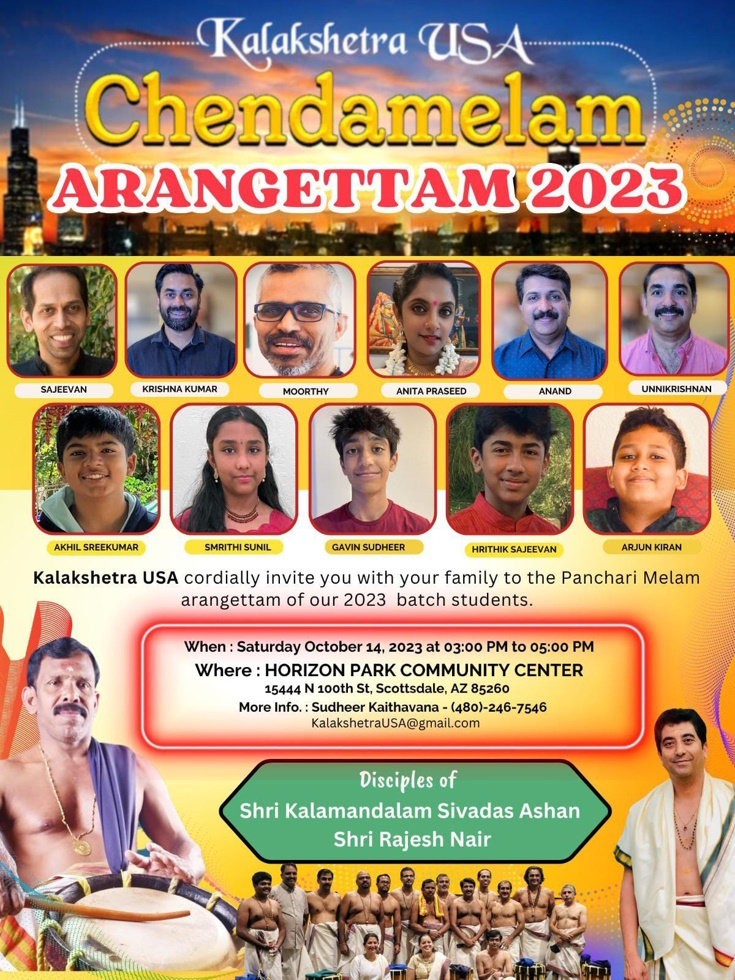 ഫീനിക്സ്: കലാക്ഷേത്ര യുഎസ്എ യുടെ ചെണ്ട പഠന വിദ്യാലയത്തിലെ കലാകാരന്മാരുടെ അരങ്ങേറ്റം ശനിയാഴ്ച ഒക്ടോബര് 14ന് സ്കോട്ട് ഡൈല് നഗരത്തിലെ ഹൊറിസോണ് പാര്ക്ക് ഓഡിറ്റോറിയത്തില് വച്ച് നടക്കും. മേള കലാരത്നം ശ്രീ കലാമണ്ഡലം ശിവദാസ് ഗുരുക്കളുടെ ശിഷ്യത്വത്തില് രാജേഷ് നായരുടെ നേതൃത്വത്തിലാണ് അഞ്ചു കുട്ടികളടക്കം 11 കലാകാരന്മാരുടെ ചെണ്ട വാദ്യം അരങ്ങേറ്റം നടക്കുന്നത്. കലാക്ഷേത്രയുടെ രണ്ടാമത്തെ ബാച്ചിന്റെ അരങ്ങേറ്റമാണിത്. കഴിഞ്ഞ അരങ്ങേറ്റത്തില് ഏകദേശം മുപ്പതു കലാകാരന്മാര് ചെണ്ട വാദ്യ കലയില് അരങ്ങേറ്റം നടത്തിയതായി കലാക്ഷേത്ര