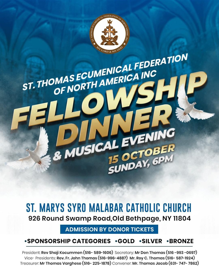 ന്യൂയോർക്ക്: ന്യൂയോർക്കിലെ മലയാളി ക്രൈസ്തവ കൂട്ടായ്മയായ സെൻറ് തോമസ് എക്യൂമെനിക്കൽ ഫെഡറേഷൻ ഓഫ് നോർത്ത് അമേരിക്കയുടെ ആഭിമുഖ്യത്തിൽ നടത്തപ്പെടുന്ന ഈവർഷത്തെ ഫെല്ലോഷിപ്പ് ഡിന്നർ ഒക്ടോബർ മാസം 15-നു വൈകുന്നേരം 6-മണിക്ക് ഓൾഡ് ബെത്പേജിലുള്ള സെൻറ്. മേരിസ് സീറോ മലബാർ കാത്തോലിക്കാ പള്ളി ഓഡിറ്റോറിയത്തിൽ വച്ച് നടത്തപ്പെടുന്നു.