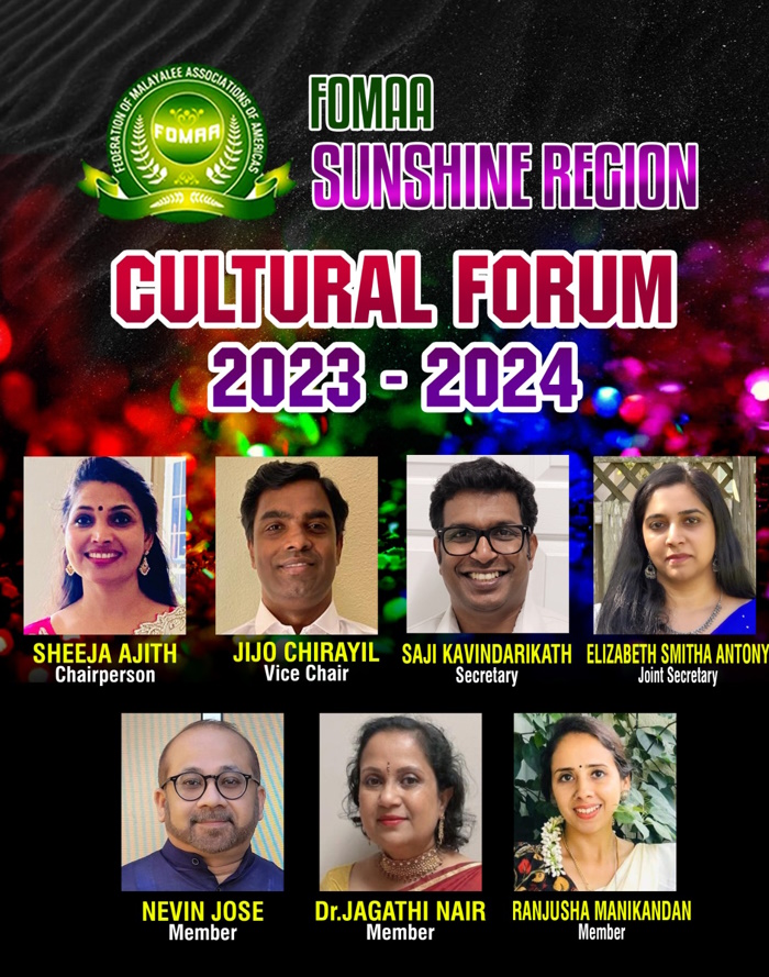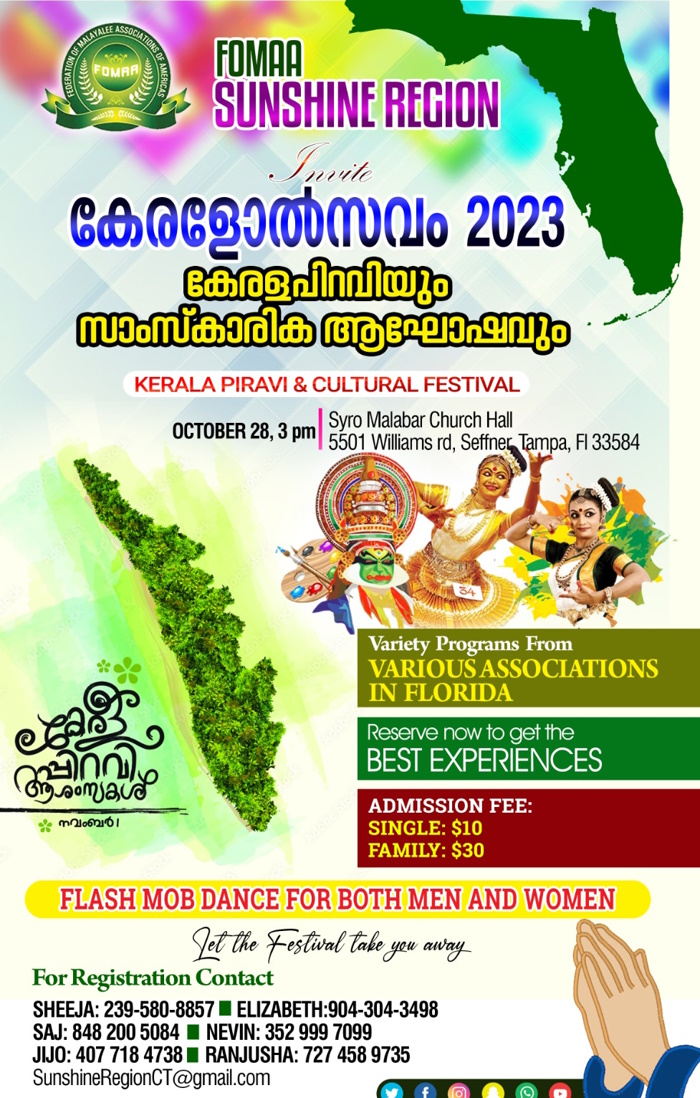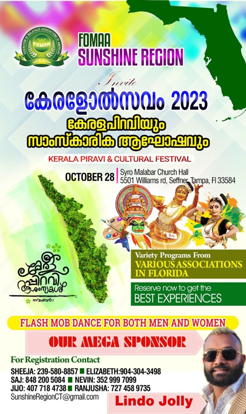 ഫ്ലോറിഡ: അമേരിക്കയിലെ കേരളം എന്നറിയപ്പെടുന്ന ഫ്ലോറിഡയിൽ ഫോമാ സൺഷൈൻ റീജിയന്റെ നേതൃത്വത്തിൽ കൾച്ചറൽ ഫോറം കമ്മിറ്റി ഇദംപ്രഥമമായി കേരളോത്സവം 2023 സംഘടിപ്പിക്കുന്നു.
