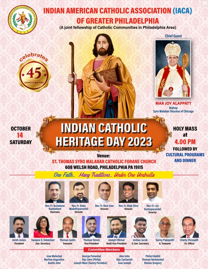 ഫിലഡല്ഫിയ: വിശാല ഫിലാഡല്ഫിയ റീജിയണിലെ ഇന്ഡ്യന് കത്തോലിക്കരുടെ പ്രത്യേകിച്ച് കേരള പാരമ്പര്യത്തിലൂള്ള കത്തോലിക്കരുടെ സ്നേഹകൂട്ടായ്മയായ ഇന്ഡ്യന് അമേരിക്കന് കാത്തലിക് അസോസിയേഷന് ഓഫ് ഗ്രേറ്റര് ഫിലാഡല്ഫിയാ (ഐ. എ. സി. എ.) ഇന്ഡ്യന് കാത്തലിക് ഹെറിറ്റേജ് ദിനം വിവിധ പരിപാടികളോടെ ആഘോഷിക്കുന്നു.