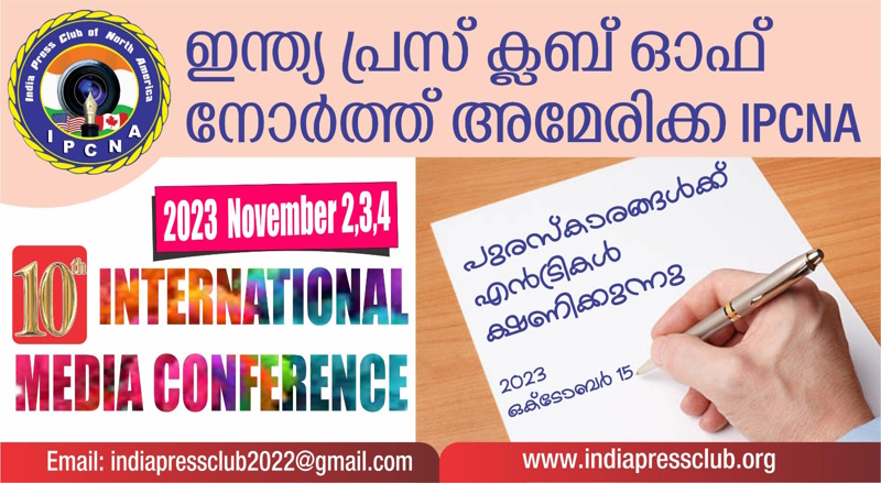 മയാമി: 2023 നവംബർ 2 മുതൽ 4 വരെ മയാമിയിലുള്ള ഹോളിഡേ ഇൻ മയാമി വെസ്റ്റ് ഹോട്ടലിൽ നടക്കുന്ന ഇന്ത്യാ പ്രസ് ക്ലബ് ഓഫ് നോർത്ത് അമേരിക്ക (IPCNA ) അന്താരാഷ്ട്ര മാധ്യമ സമ്മേളനത്തിനോടനുബന്ധിച്ച് വിവിധ മേഖലകളിൽ മികവ് തെളിയിച്ച വ്യക്തികളെയും സംഘടനകളെയും പുരസ്കാരങ്ങൾ നൽകി ആദരിക്കുന്നു.