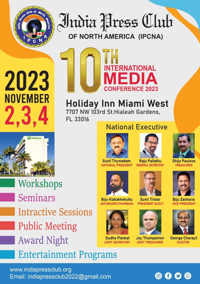 ഇന്ത്യ പ്രസ് ക്ലബ് സമ്മേളനത്തിൽ രാഷ്ട്രീയ-സാമൂഹിക-മാധ്യമ രംഗത്തെ പ്രമുഖർ പങ്കെടുക്കും. നവം :3 വെളിയാഴ്ചയും ,4 ശനിയാഴ്ചയും രാവിലെ 10 മുതൽ രാത്രി 10 മണി വരെ സെമിനാറുകളും, ഓപ്പൺ ഫോറവും , പൊതു സമ്മേളനവും , വൈവിധ്യമാർന്ന കലാപരിപാടികളും നടക്കും. ഏവർക്കും പ്രവേശനം സൗജന്യമാണ് .