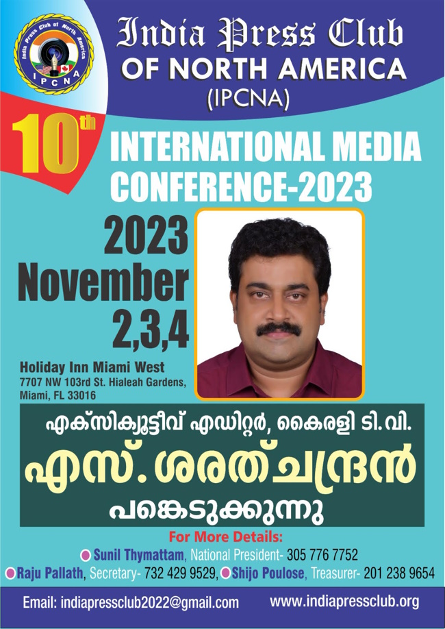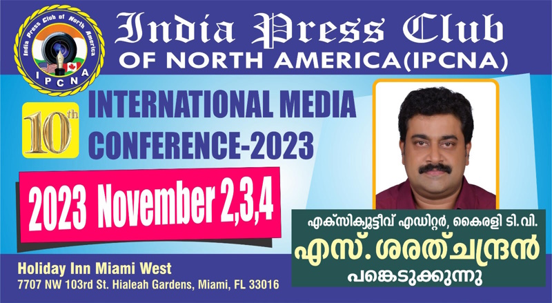 മയാമി: 2023 നവംബർ 2 മുതൽ 4 വരെ മയാമിയിലുള്ള ഹോളിഡേ ഇൻ മയാമി വെസ്റ്റ് ഹോട്ടലിൽ നടക്കുന്ന ഇന്ത്യ പ്രസ് ക്ലബ് ഓഫ് നോർത്ത് അമേരിക്ക (IPCNA ) അന്താരാഷ്ട്ര മാധ്യമ സമ്മേളനത്തിൽ കൈരളി ടി വി എക്സിക്യൂട്ടീവ് എഡിറ്റർ എസ് ശരത് ചന്ദ്രൻ പങ്കെടുക്കും.