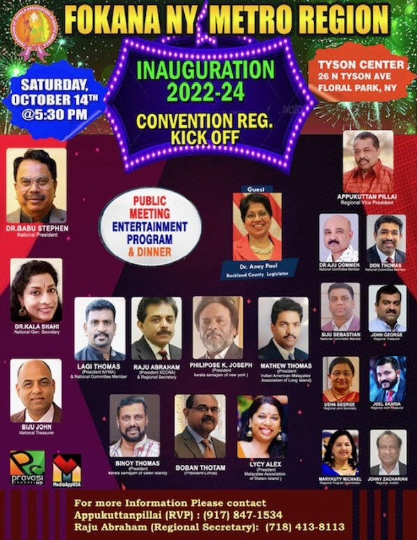 ന്യൂയോര്ക്ക്: ഫൊക്കാന ന്യൂയോര്ക്ക് മെട്രോ റീജിയൺ ഉൽഘാടനവും രെജിസ്ട്രേഷൻ കിക്ക് ഓഫും ഒക്ടോബർ 14 ശനിയാഴ്ച വൈകിട്ട് 5.30 ന് ടൈസൺ സെന്ററിൽ (26 N Tyson Ave, Floral Park, NY) വെച്ച് നടത്തുന്നതാണെന്നു റീജിണൽ വൈസ് പ്രസിഡന്റ് അപ്പുകുട്ടൻ പിളള അറിയിച്ചു. ഫൊക്കാന പ്രസിഡന്റ് ഡോ. ബാബു സ്റ്റീഫൻ റീജണൽ കൺവെൻഷൻ ഉൽഘടനം ചെയ്യുന്നതും റോക്ലാൻഡ് കൗണ്ടി ലെജിസ്ലേറ്റർ ഡോ. ആനി പോൾ മുഖ്യ അഥിതിയായി പങ്കെടുക്കുന്നു.