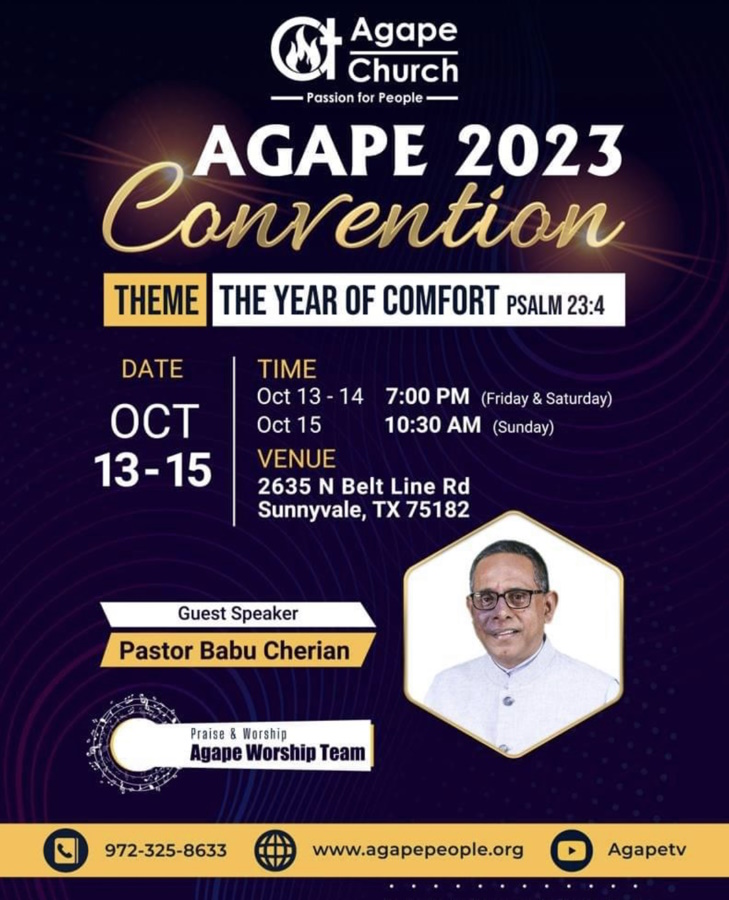 ഡാലസ്: സണ്ണിവെയിൽ അഗാപ്പെ ചർച്ചിന്റെ നേതൃത്വത്തിൽ ഒക്ടോബർ 13 മുതൽ 15 വരെ (2635 നോർത്ത് ബെൽറ്റ് ലൈൻ, സണ്ണിവെയിൽ 75182 },വെച്ച് നടത്തപ്പെടുന്ന ത്രി ദിന കൺവെൻഷനിൽ പ്രമുഖ ആത്മീയ പ്രഭാഷകൻ ,പാസ്റ്റർ ബാബു ചെറിയാൻ വചന പ്രഘോഷണം നിർവഹിക്കും
