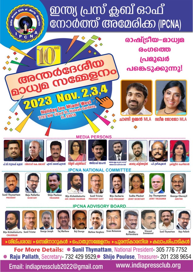 ഇന്ത്യ പ്രസ് ക്ലബ് സമ്മേളനത്തിൽ രാഷ്ട്രീയ-സാമൂഹിക-മാധ്യമ രംഗത്തെ പ്രമുഖർ പങ്കെടുക്കും. നവം :3 വെള്ളിയാഴ്ചയും ,4 ശനിയാഴ്ചയും രാവിലെ 10 മുതൽ രാത്രി 10 മണി വരെ സെമിനാറുകളും, ഓപ്പൺ ഫോറവും , പൊതു സമ്മേളനവും , വൈവിധ്യമാർന്ന കലാപരിപാടികളും നടക്കും. ഏവർക്കും പ്രവേശനം സൗജന്യമാണ് .