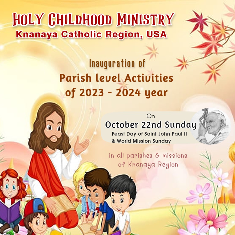 ഷിക്കാഗോ: അമേരിക്കയിലെ ക്നാനായ കത്തോലിക്ക റീജിയണിലെ ഹോളി ചൈൽഡ്ഹുഡ് മിനിസ്ട്രി (തിരുബാല സഖ്യം) യുടെ 2023 – 2024 വർഷത്തെ ഇടവക തലത്തിലുള്ള പ്രവർത്തനോദ്ഘാടനം ഒക്ടോബർ 22ന് നടത്തപ്പെടും. ആഗോള സഭാ മിഷൻ ഞായറായി ആചരിക്കുന്ന അന്നേദിവസം വിശുദ്ധ ജോൺ പോൾ രണ്ടാമൻ പാപ്പയുടെ തിരുനാൾ ദിനം കൂടിയാണ്.