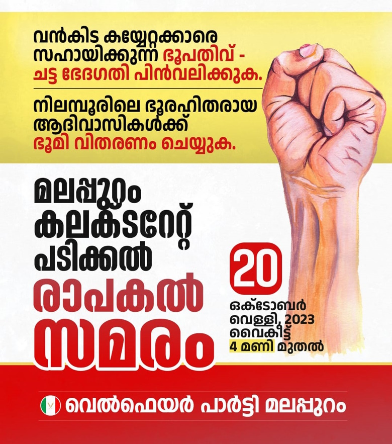 മലപ്പുറം : നിലമ്പൂരിലെ ഭൂരഹിതരായ ആദിവാസികൾക്ക് ഭൂമി വിതരണം ചെയ്യുക, വൻകിട കയ്യേറ്റക്കാരെ സഹായിക്കുന്ന ഭൂപതിവ് ചട്ട ഭേദഗതി പിൻവലിക്കുക എന്നീ ആവശ്യങ്ങൾ ഉന്നയിച്ച് നാളെ (2023 ഒക്ടോബർ 20 വൈകീട്ട് 4 മണി) മുതൽ കളക്ട്രറ്റ് പടിക്കൽ രാപ്പകൽ സമരം നടത്തും.