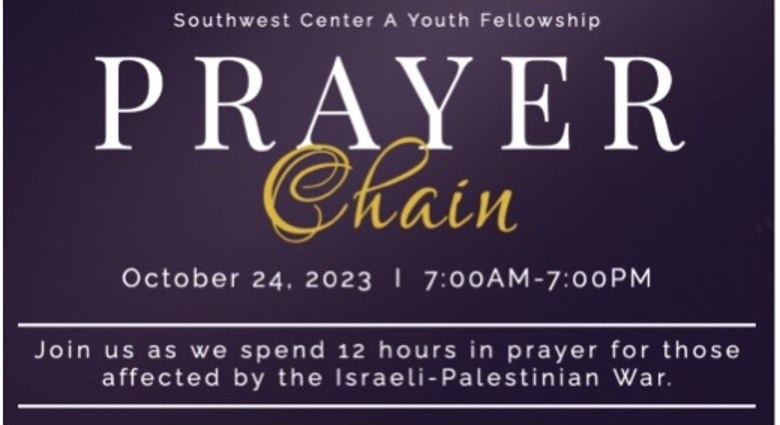 ഡാളസ്: ഇസ്രയേൽ – പാലസ്തീൻ യുദ്ധത്തിൽ ദുരിതമനുഭവിക്കുന്നവർക്ക് പ്രാർത്ഥന സഹായവുമായി നോർത്ത് അമേരിക്ക-യൂറോപ്പ് ഭദ്രാസന സൗത്ത് വെസ്റ്റ് സെന്റർ എ യൂത്ത് ഫെല്ലോഷിപ്പ്. ഒക്ടോബർ 24 രാവിലെ 7 മണി മുതൽ വൈകിട്ട് 7 മണി വരെയാണ് ചെയിൻ പ്രയർ ക്രമീകരിച്ചിട്ടുള്ളത്. യുദ്ധം ആരംഭിച്ച ഇന്നുവരെയുള്ള കണക്കുകളനുസരിച്ച് 4131 പേർ മരിച്ചുവെന്നും, 13270 പേർക്ക് ഗുരുതരമായ പരിക്കേറ്റിട്ടുണ്ട് എന്നും, 720 കുട്ടികളുൾപ്പെടെ 1400 പേരെ കാണുവാനില്ല എന്നും ഔദ്യോഗിക റിപ്പോർട്ടുകളിൽ പറയുന്നു.