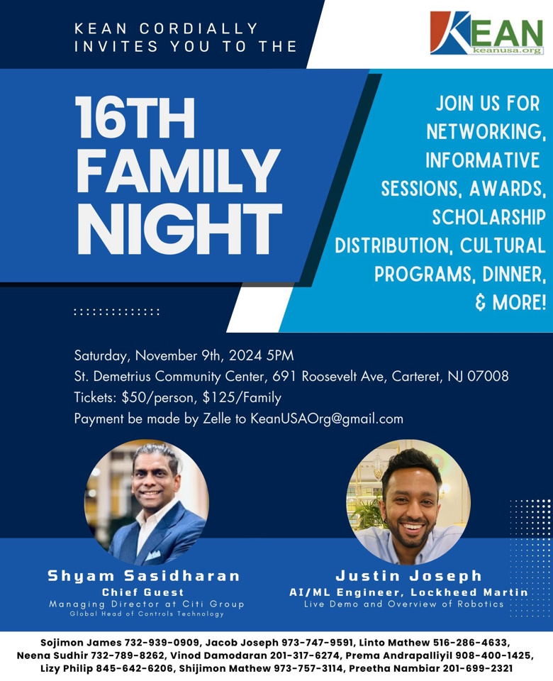 കൂടുതൽ വിവരങ്ങൾക്ക് : ഷിജി മാത്യു – പ്രസിഡന്റ് 973 757 3114, ജേക്കബ് ജോസഫ് 973-747-9591, പ്രേമ ആന്ദ്രപ്പള്ളി 908 -400-1425.