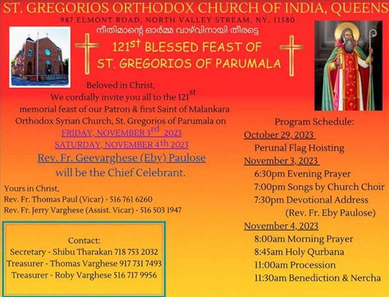 മലങ്കര സഭയുടെ പ്രഖ്യാപിത പരിശുദ്ധനായ പരുമല തിരുമേനിയുടെ 121-ആം ഓർമ്മപെരുന്നാൾ , അമേരിക്കയിലെ പരുമല എന്നറിയപ്പടുന്ന ക്യുൻസ് സെന്റ് ഗ്രീഗോറിയോസ് ഓർത്തഡോൿസ് ദേവാലയത്തിൽ നവംബർ 3,4 തീയതികളിൽ നടത്തപ്പെടുന്നു.