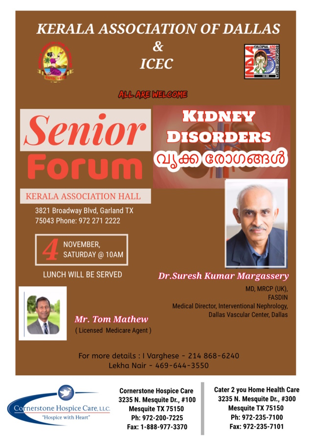 ഡാളസ്: കേരള അസോസിയേഷൻ ഓഫ് ഡാളസിന്റെയും ഇന്ത്യ കൾച്ചറൽ ആന്റ് എഡ്യൂക്കേഷൻ സെന്ററിന്റെയും സംയുക്ത ആഭിമുഖ്യത്തിൽ സീനിയർ ഫോറം സംഘടിപ്പിക്കുന്നു.