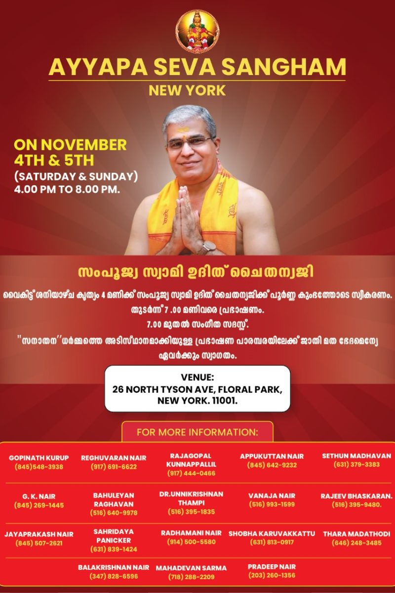 ന്യൂയോർക്ക്: സനാതന ധർമ്മത്തെ അടിസ്ഥാനമാക്കിയുള്ള സ്വാമി ഉദിത് ചൈതന്യജി നയിക്കുന്ന പ്രസംഗ പരമ്പര നവംബർ 4, 5 (ശനി, ഞായർ) തിയ്യതികളില് വൈകുന്നേരം 4 മണി മുതൽ ന്യൂയോര്ക്കിലെ ടൈസന് സെന്ററില് (26 North Tyson Ave, Floral Park, New York 11001) ആരംഭിക്കും.
